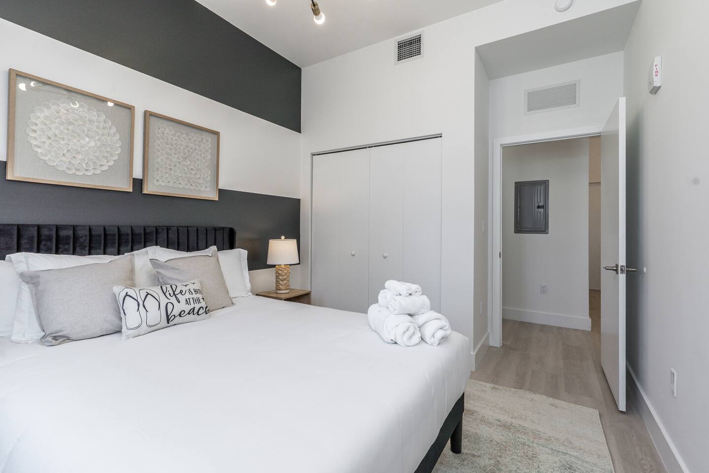 This 2-bedroom, 2-bathroom apartment features a spacious, private terrace ideal for soaking up the Florida sunshine or enjoying a beautiful sunset. Inside, the open and airy layout is fully furnished with Classy Coastal decor, providing the perfect home base for your vacation. The fully equipped kitchen includes all the necessary appliances and tools for preparing meals or snacks. Stay connected with high-speed internet, and enjoy the convenience of a smart lock for easy self-check-in. Whether you're a couple seeking romance or a small family needing a worry-free stay, this space was made for you. Amenities include: 🛌🏻2 Bedrooms: Comfortable beds with premium linens, a spacious closet, and bedside tables with lamps. 🖥️Work Space: The main bedroom fetuares has a dedicated work station in the bedroom. With ample space you can focus on tasks. 🛋️Living Area: Cozy sofa bed, Smarth TV, armchairs and acoffee table perfect for winding down after a day of exploring! 👩🏻🍳Kitchen: Fully equipped with a stove, oven, refrigerator, dishwasher, microwave, coffee maker, toaster and all cooking essentials. 🛁 2 Bathrooms: Modern fixtures, including a bathtub with towels and toiletries provided. 🧺Laundry: Enjoy the convenience of an in-unit washer and dryer, making it easy to keep your clothes fresh and clean during your stay. 🏖️Terrace: Private space to relax, with seating for two. 📶 Fast WiFi & 📺 Smart TV: Stay connected, stream your favorites, or work remotely in comfort. ❄️ Air conditioning: Keep every room cool and comfortable, day or night. 📍 Location: Prime location: we are only 5 minutes driving to the shore. Nearby you'll find supermarkets, restaurants, and local attractions to explore and enjoy. 💬 Additional Details: Flexible self check-in with smart lock for your convenience. Ideal for both short getaways and extended stays. We're happy to provide local tips and recommendations to help you make the most of your visit.